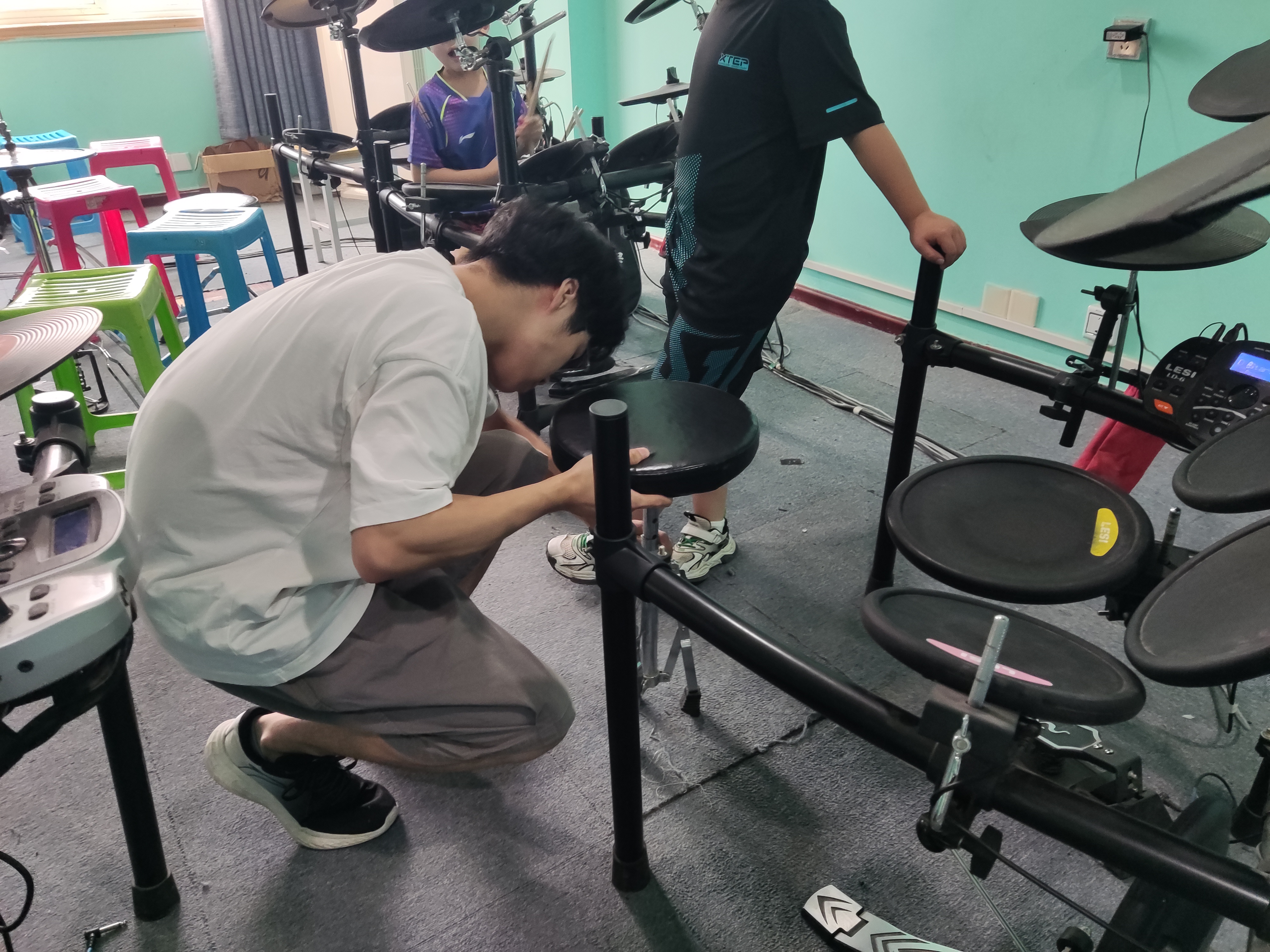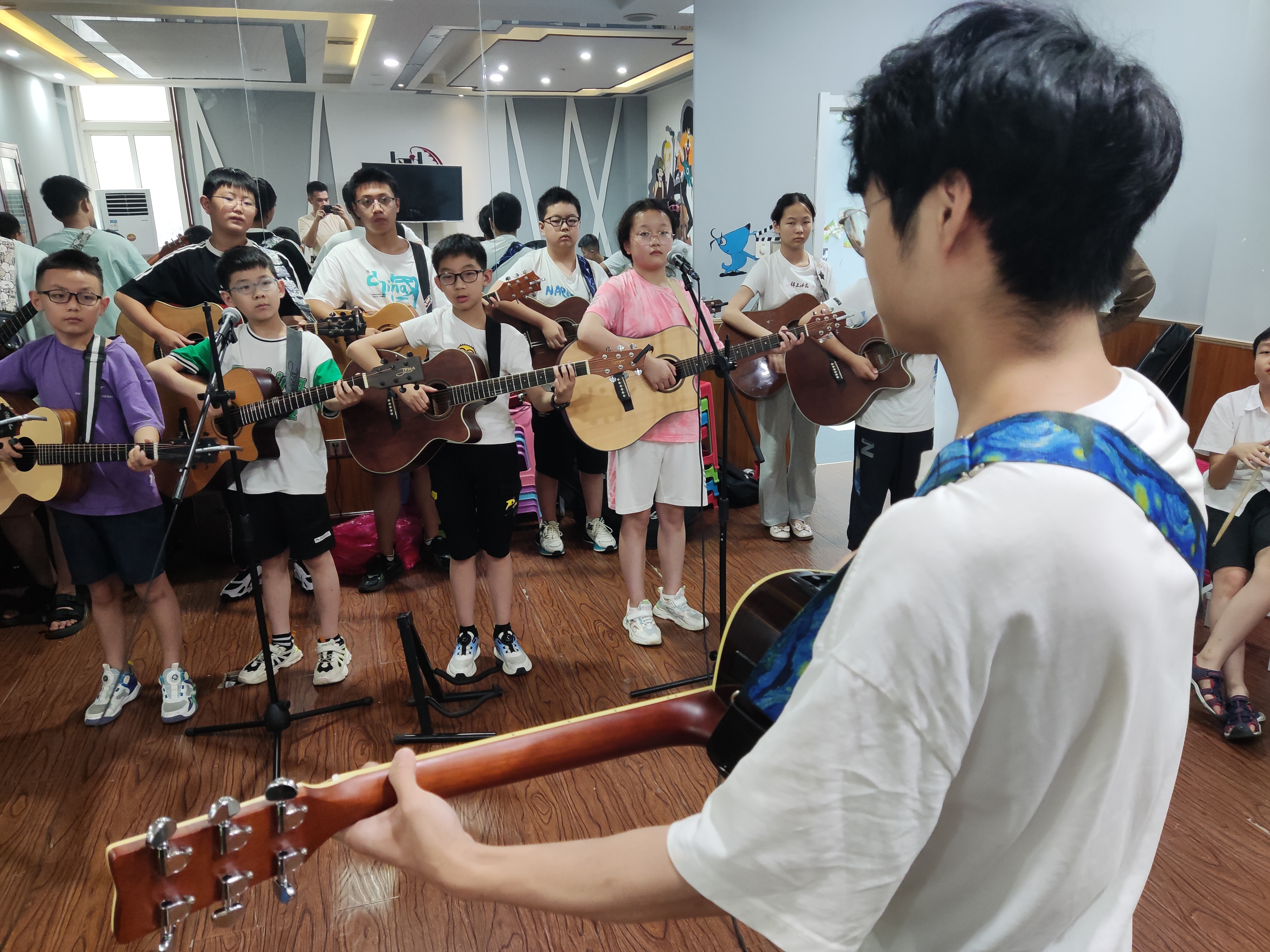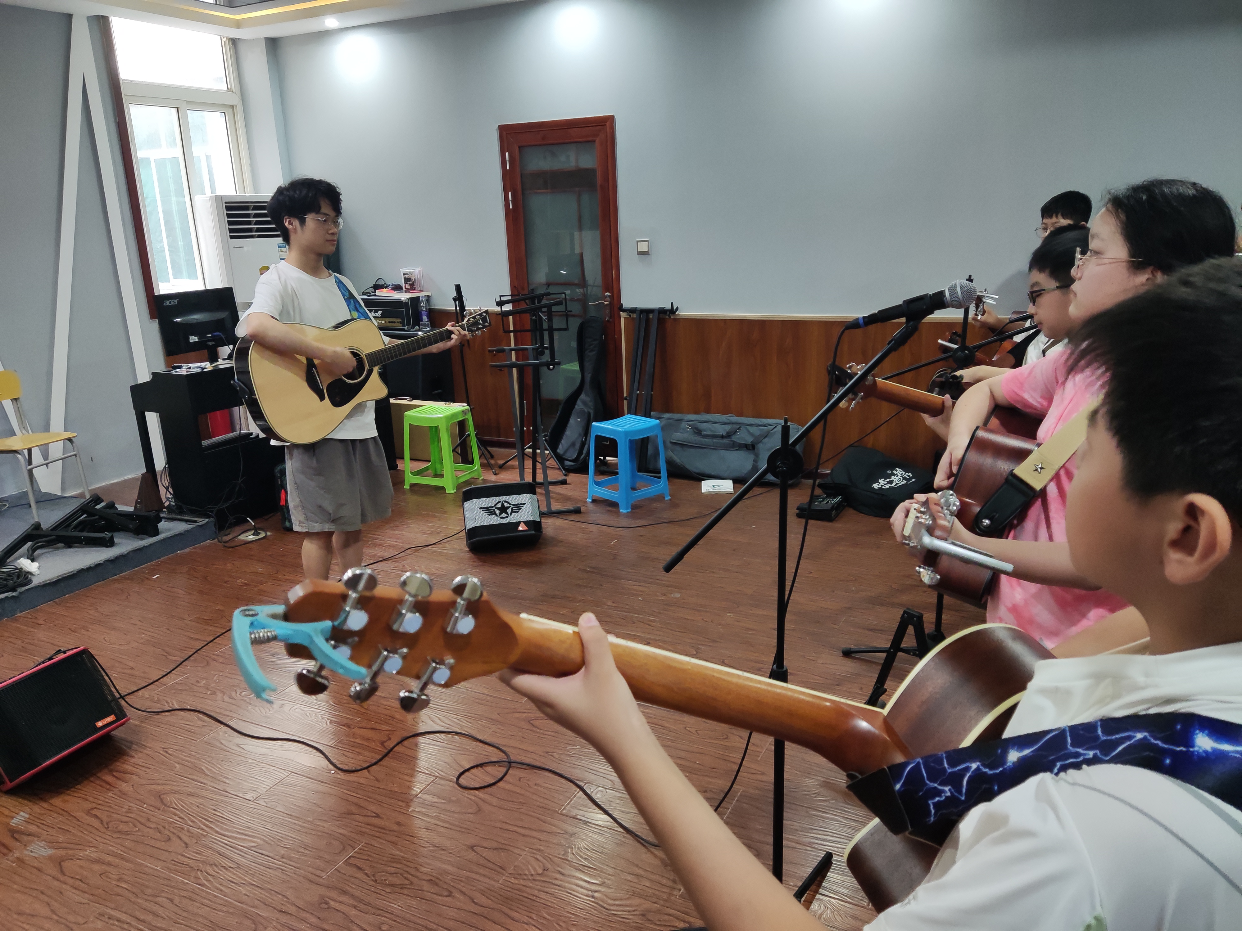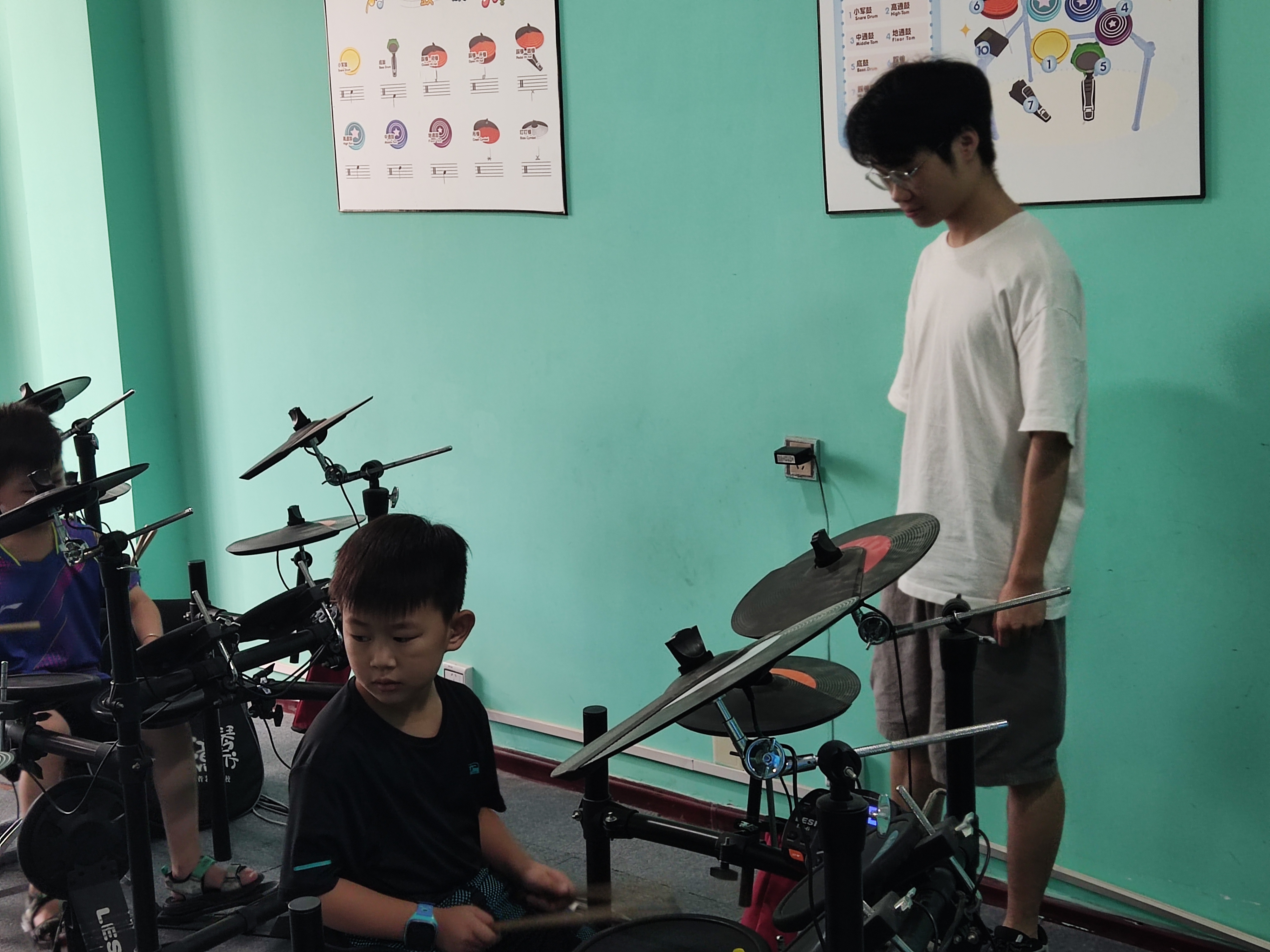 7月30日,刘建焜同学来到家乡的梵音琴行开始了兼职工作,他的主要工作是帮助学生正确理解音乐理论,指导他们掌握正确的乐器演奏技巧,解答他们在学习过程中遇到的问题,以及与其它教师协作,共同完成教学目标。刘建焜同学通过生动的演示和耐心的指导,将复杂的音乐理论变得生动有趣。他注重培养学生的学习兴趣,激发他们的内在潜力,让他们在轻松愉快的氛围中掌握吉他和架子鼓的演奏技巧。