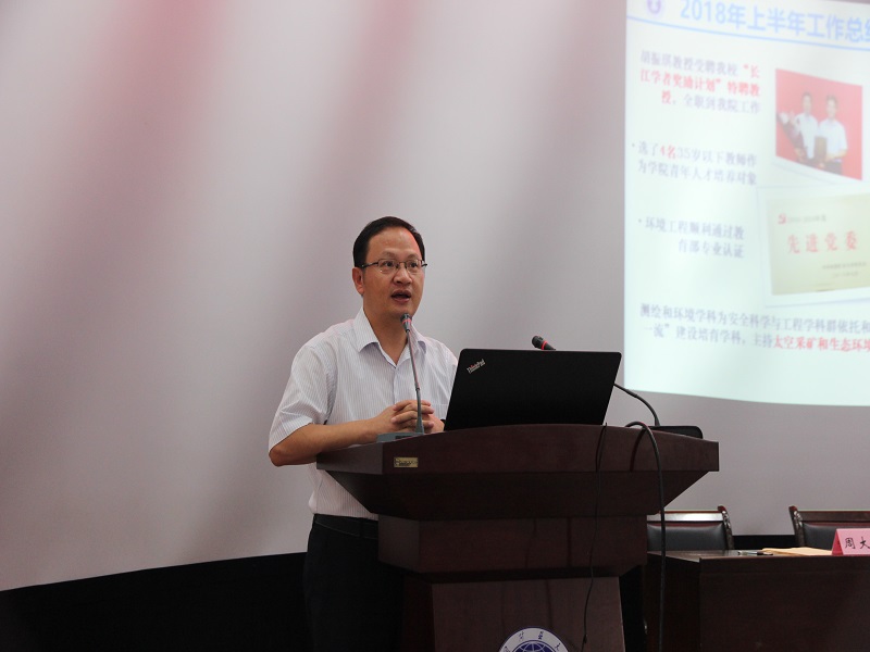 张绍良院长对2018上半年的工作进行总结。他指出,在落实学院各项重点工作过程中,环测学院全体教职工齐心协力,有效地促进了各项工作的按期推进,取得了优异的成绩。在2018年,学院取得了重大成就,其中包括获得国家科技进步奖2项、地理信息科技进步奖一等奖1项、二等奖2项、环境工程顺利通过教育部专业认证、环境生态学ESI贴近度达到72%以及院党委被评为2016-2018年度先进党委等。随后,张绍良院长对下学期的学科建设、人才培养、科学研究等工作进行了部署,提出做好新一轮岗位聘任工作,完善考核制度、推进“中非国际合作研究中心”建设工作、启动测绘工程第二轮认证工作等具体措施。他还重点指出,学院要积极推进“双一流”学科和向ESI一流学科建设工作的奋斗方向。