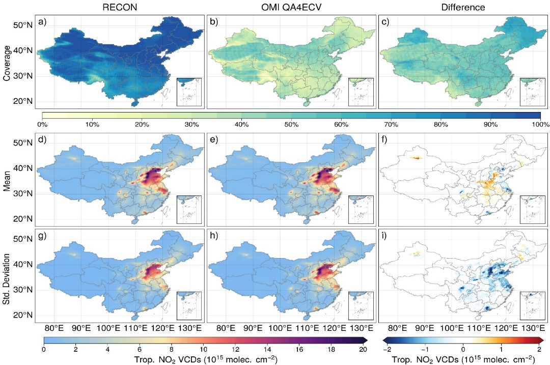 重构得到的结果使有效的对流层NO2柱浓度数据量翻番,并且与地基观测结果能良好地吻合。通过对遥感数据的质量改善处理,该数据集增强了时空连续性,极大地提升了遥感监测的应用潜力,将有助于空气质量和气候学的研究。