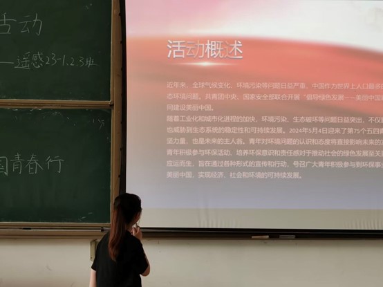 为贯彻落实习近平总书记提出的“绿水青山就是金山银山”的思想,进一步引导广大学生践行绿色发展理念,2024年5月22日16:15,遥感科学与技术23-2班团支部联合遥感科学与技术23-1班团支部、遥感科学与技术23-3班团支部在博1A101举办“倡导绿色发展,美丽中国青春行”主题团日活动。此次活动由三个班级团支书张译文、王子赫、唐瑞婕主持。