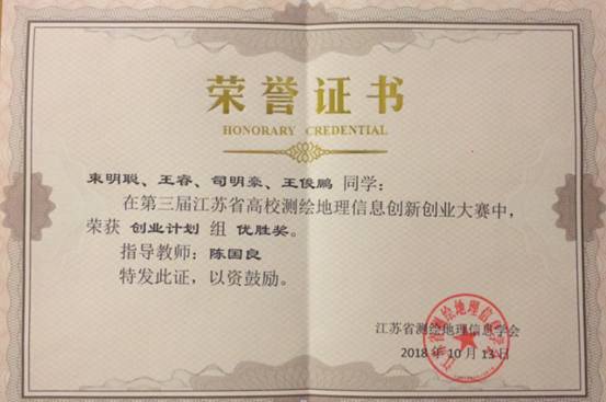 测绘地理信息系高度重视此次比赛,经过前期认真准备、队员多次模拟训练,同时组织张书毕老师、陈国良老师、孙亚琴老师多次指导修改,在此次比赛分别获得研究生创新开发一等奖(张超、张良桥、靳赛州和王轩)和创业优胜奖(束明聪、王睿、司明豪、王俊鹏)。