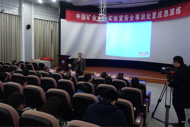 按照事故危害的层级由低到高,参演人员先后模拟了浓硫酸倾倒泼洒实验台面、实验室有机废液泄漏、实验引发火灾3个事故案例的应急处置。在最后一个案例中,保卫处、校医院、徐州市公安消防支队先后演练了应急救援和险情处置、心肺复苏急救、科学消防灭火等内容。为确保演练效果,现场不允许围观,所有师生在环B109观看了视频直播。演练结束后,赵建岭副校长进行了点评并同演练人员和工作人员合影留念。